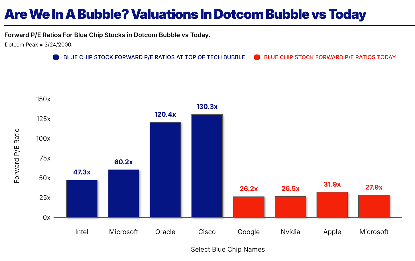 As markets trade near all-time highs, it’s natural to wonder whether we are in a bubble. After all, by early 2000, earnings forecasts proved too optimistic and prices ran too far. Intel traded at almost 50x forward earnings, Microsoft at 60x, Oracle at 120x, and Cisco at 130x. When the earnings didn’t materialize, something had to give.