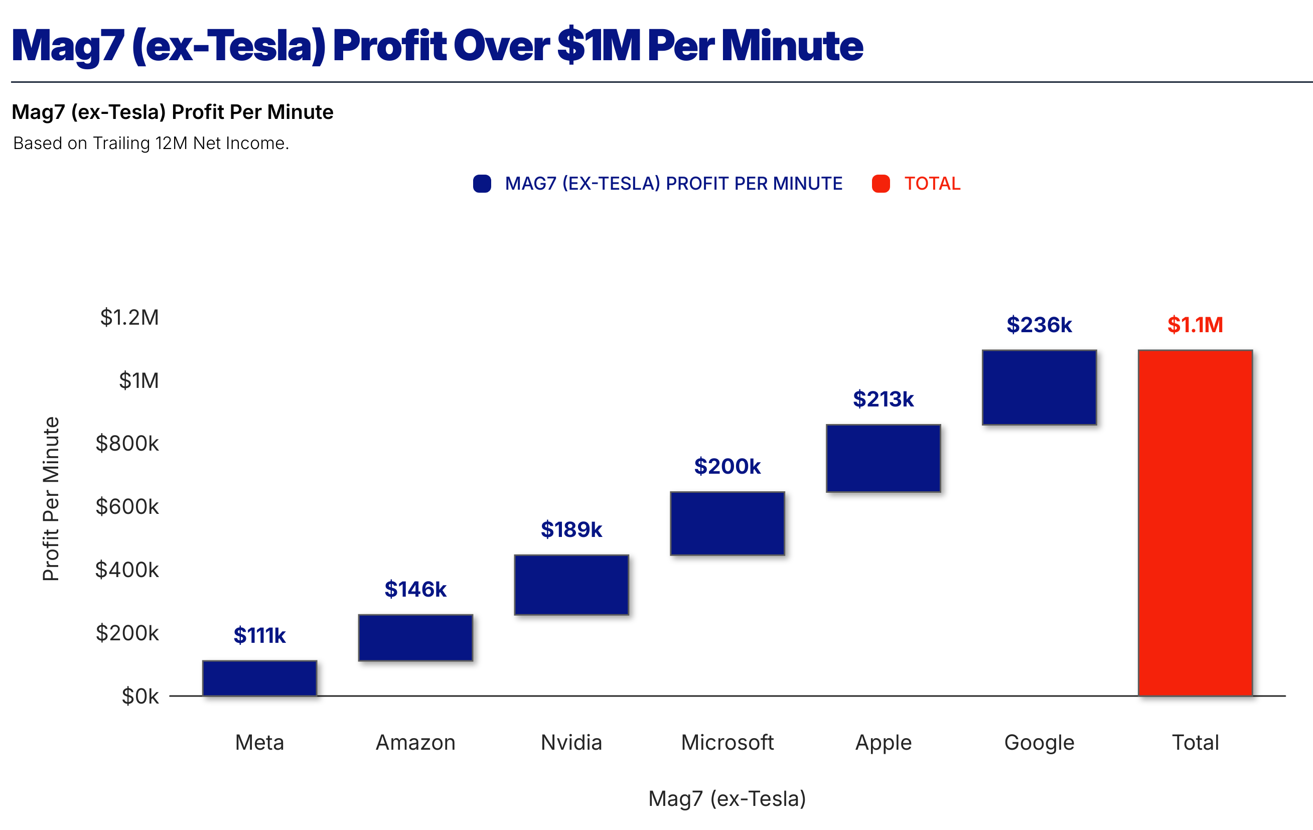 The good news for the growth portion of investor portfolios is that today isn’t 2000. Earnings aren’t promised; they’re present—at a scale the world has never seen. The modern family of tech giants (the Magnificent 7, as they’re often called) generates over $1 million of profit per minute.