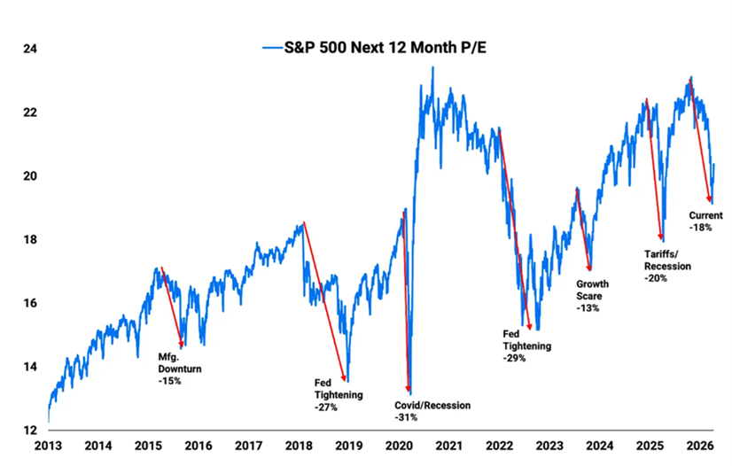 Declines of this magnitude in forward P/E are relatively rare. When they’ve occurred — during Covid, during the Fed’s aggressive tightening cycle in 2022, and during other periods of elevated fear — the compression was each time followed by a sharp rebound.