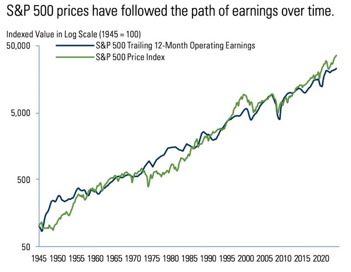 There’s a quietly powerful chart: S&P 500 Index Price plotted against S&P 500 Earnings, going back to 1945.2 Over 80 years, the two lines track each other with remarkable consistency. The message isn’t subtle. Prices follow earnings. And earnings, over time, reflect the productive capacity of human enterprise — businesses solving problems, serving customers, generating value. Periodically it slows. Sometimes it stumbles. Occasionally falls hard.
