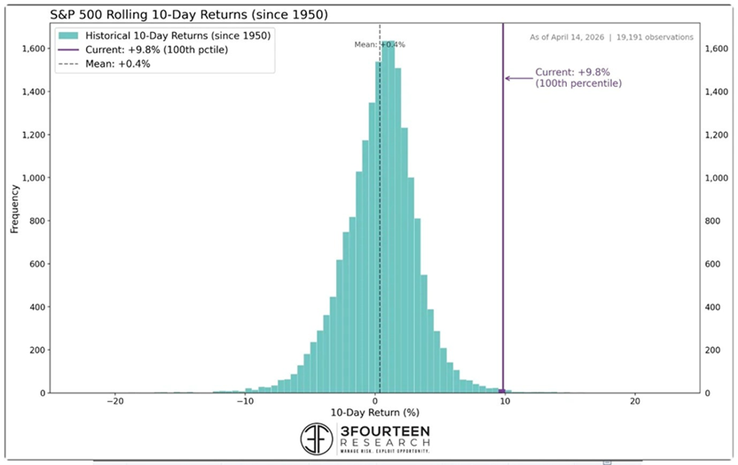 In the ten days ending April 14th, the S&P 500 rose 9.8%. Across nearly 20,000 rolling ten-day periods since 1950, that return ranks in the 100th percentile, joining only twenty other instances.1